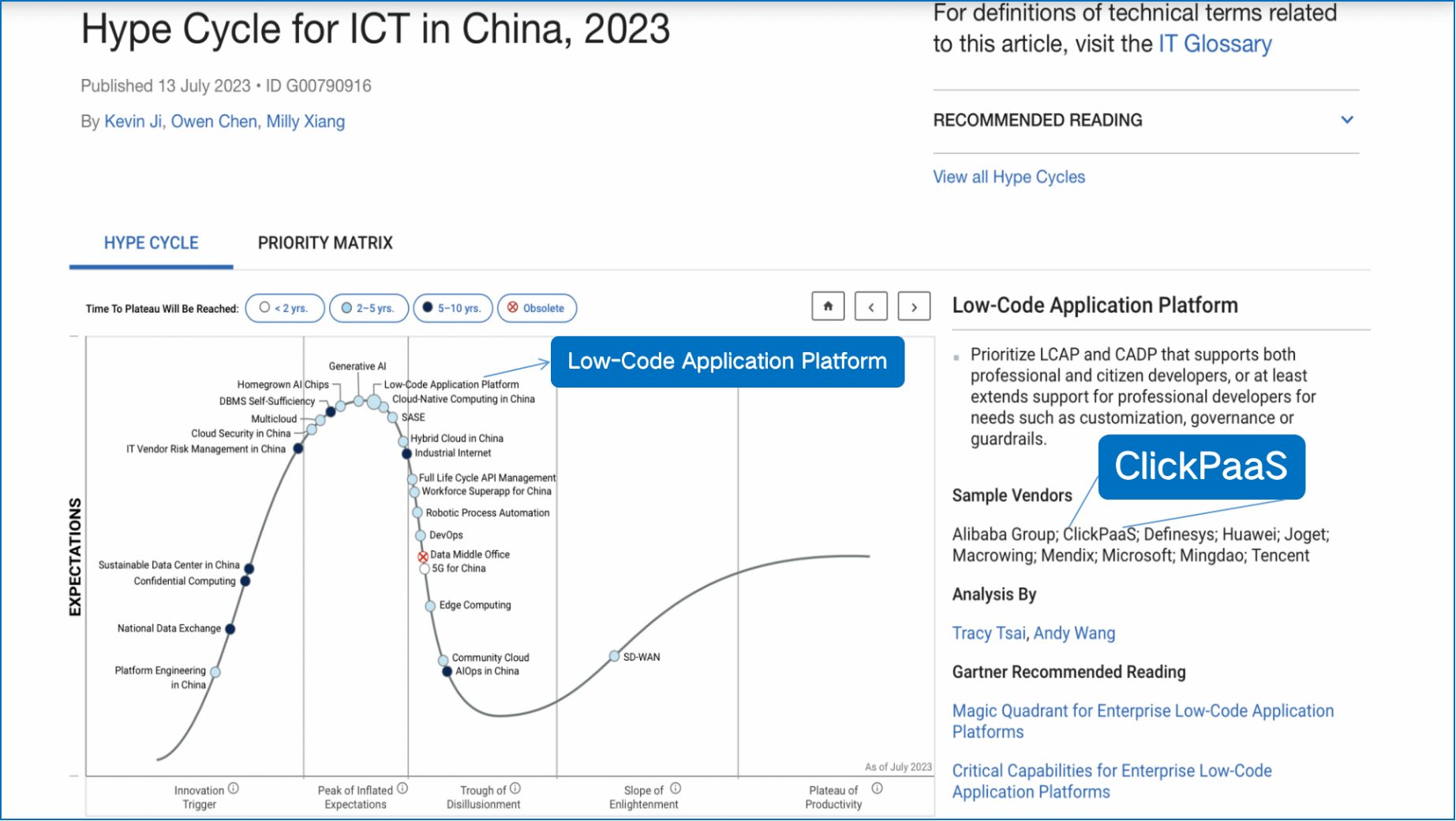 近日,国际权威研究机构Gartner发布了《Hype Cyple for ICT in China,2023(2023年中国ICT技术成熟度曲线)》报告,金年会凭借平台的aPaaS+iPaaS+DaaS保障业务系统的一站式设计,多租户、热发布、国际化、信创安全等特性实力登榜,并作为低代码PaaS平台代表厂商TOP2入选本次报告。